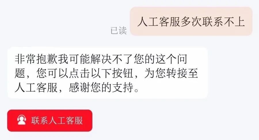 事实上,在被AI客服“折磨”到焦头烂额的一周时间里,张先生无数次想要“转人工”。不过,据他描述,客服咨询页面中未显示“转人工”按钮,即便是主动要求接入人工客服,AI客服依然会阻拦:“您有什么问题,可以先跟我说哦!”直到会话达到了一定的时长和频率,AI客服才主动承认“可能解决不了您的问题”,随即出现“联系人工客服”的按钮。