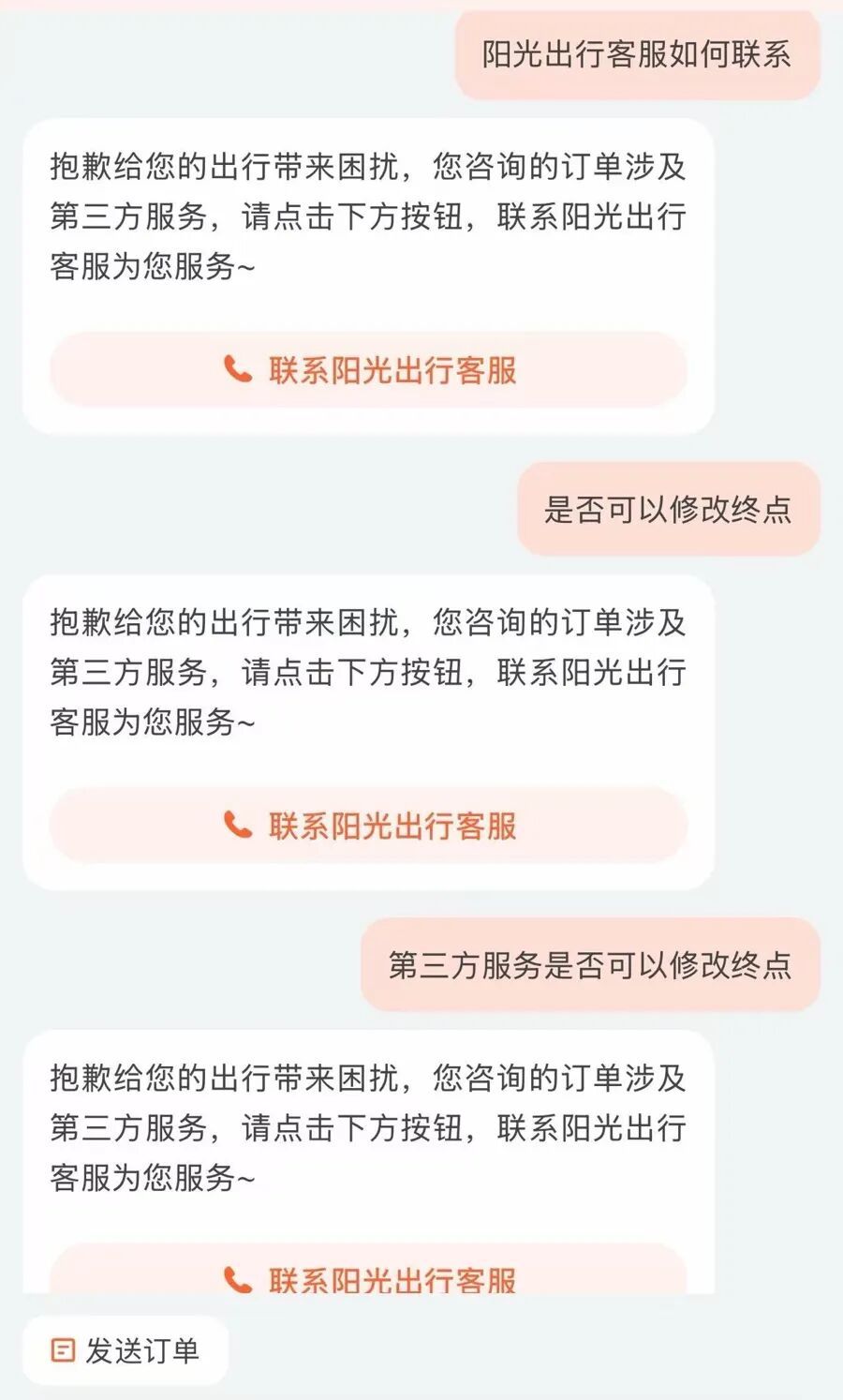 于先生第一时间联系了平台的AI客服,该AI客服告知,由于阳光出行为第三方平台,平台只能协助转接阳光出行客服,与于先生联系。谁知道,转接至阳光出行咨询页面后,上线的又是AI客服,它告知于先生,订单页面可以修改终点,在手机上操作即可。“可是我多次尝试,始终无法修改。”于先生有些哭笑不得。无奈之下,他又拨打了阳光出行的客服热线,可接电话的依然是AI客服,除了重复“手机上可以操作”的提示外,面对于先生“转人工”的诉求,AI客服不断阻拦,坚持要求他“先描述问题,以便更好处理”。就这样,在前后两通共接近20分钟的电话中,他与AI客服陷入了反复的拉扯。