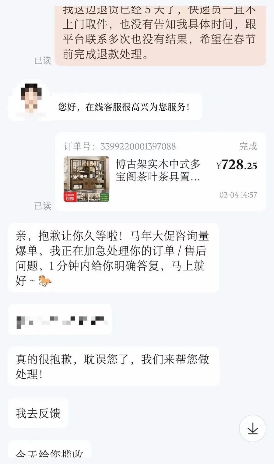 更令他苦恼的是,他购买的另一套立柜出现了发错货的情况。“可能是临近春节,我这边申请退货后,迟迟没有快递员上门取件。”他回忆道。于是,张先生每天都联系客服,催促平台安排快递员尽快揽收,但AI客服每天都在重复同一套话术:“请您稍等”“我们会尽快安排”。结果五天过去了,也没有快递员上门取件。